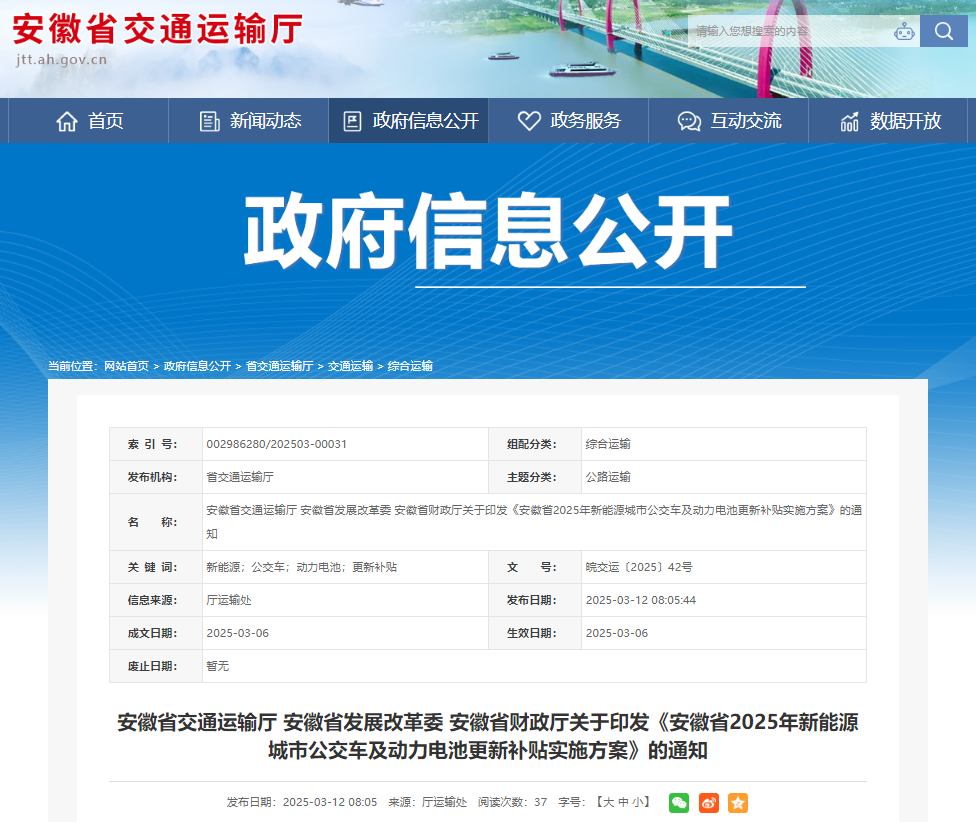 安徽省交通運(yùn)輸廳安徽省發(fā)展改革委安徽省財(cái)政廳關(guān)于印發(fā)《安徽省2025年新能源城市公交車及動(dòng)力電池更新補(bǔ)貼實(shí)施方案》的通知
