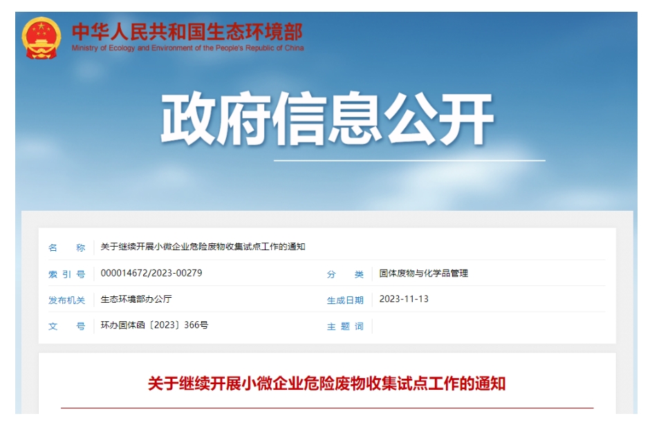 生態(tài)環(huán)境部關(guān)于繼續(xù)開展小微企業(yè)危險(xiǎn)廢物收集試點(diǎn)工作的通知