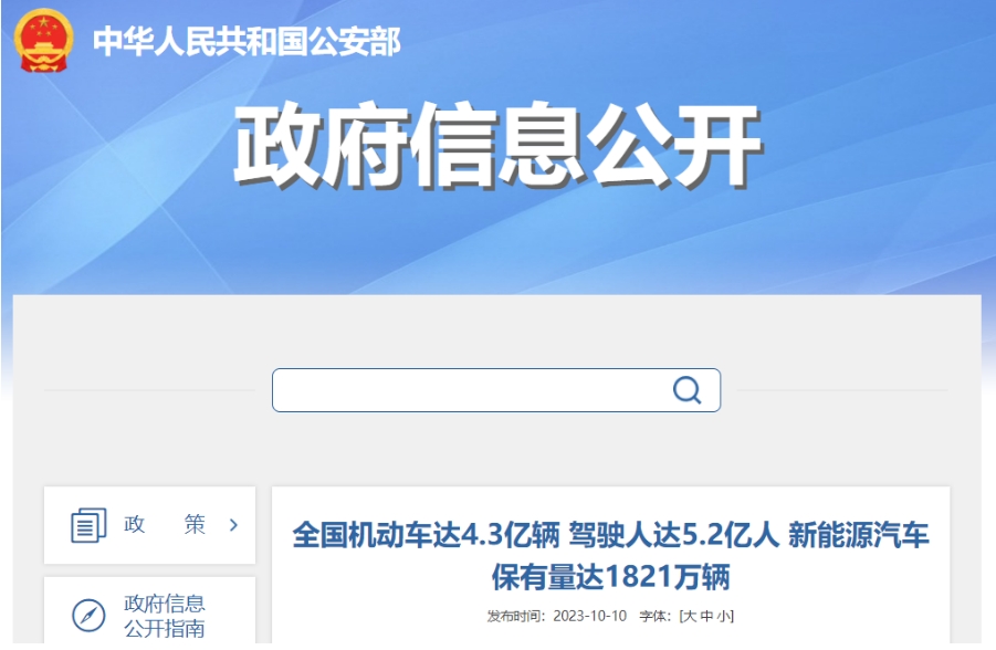 公安部:截至2023年9月底全國(guó)機(jī)動(dòng)車達(dá)4.3億輛新能源汽車保有量達(dá)1821萬輛