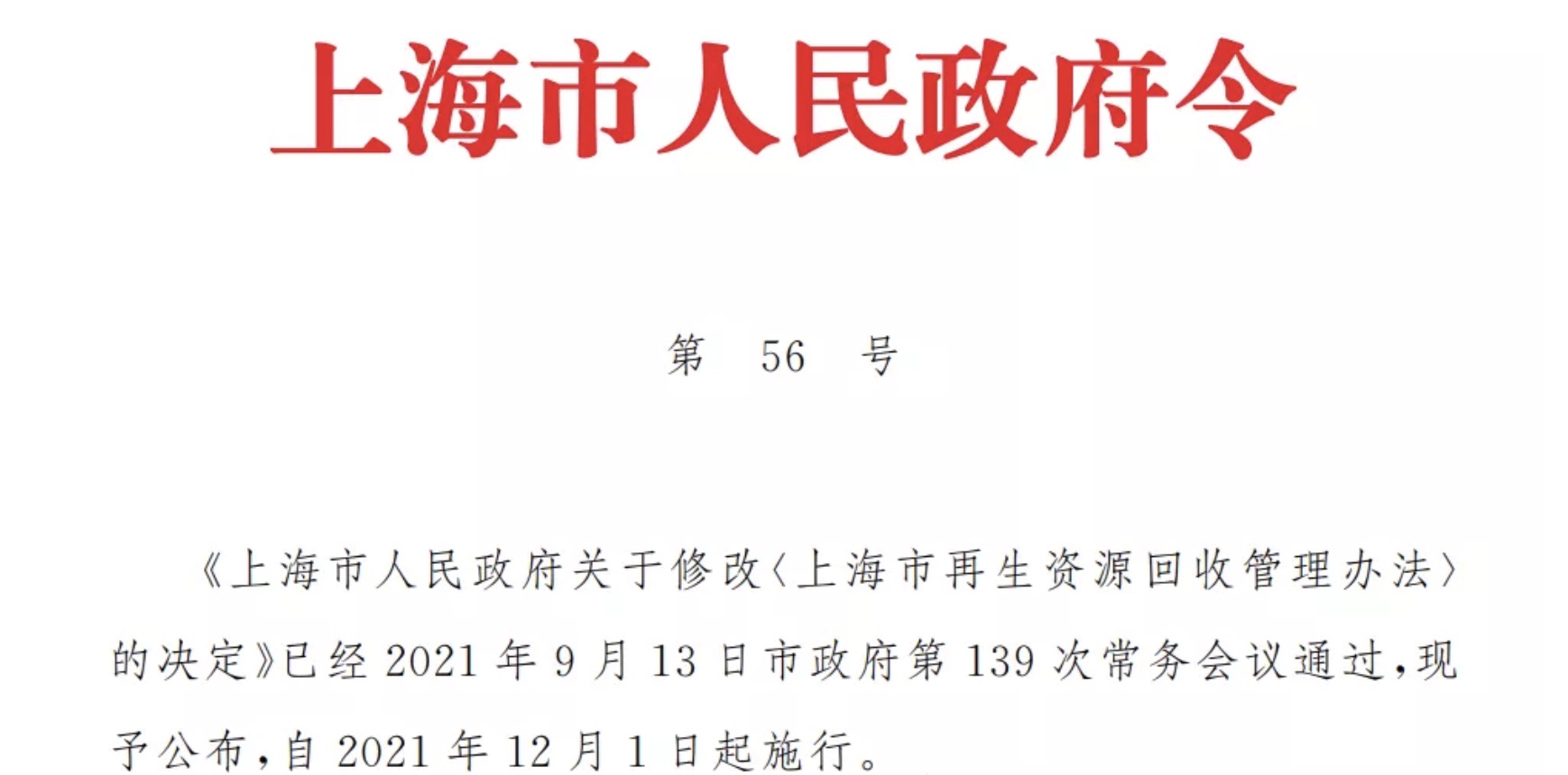 《上海市人民政府關(guān)于修改〈上海市再生資源回收管理辦法〉的決定》已經(jīng)2021年9月13日市政府第139次常務(wù)會議通過,現(xiàn)予公布,自2021年12月1日起施行。