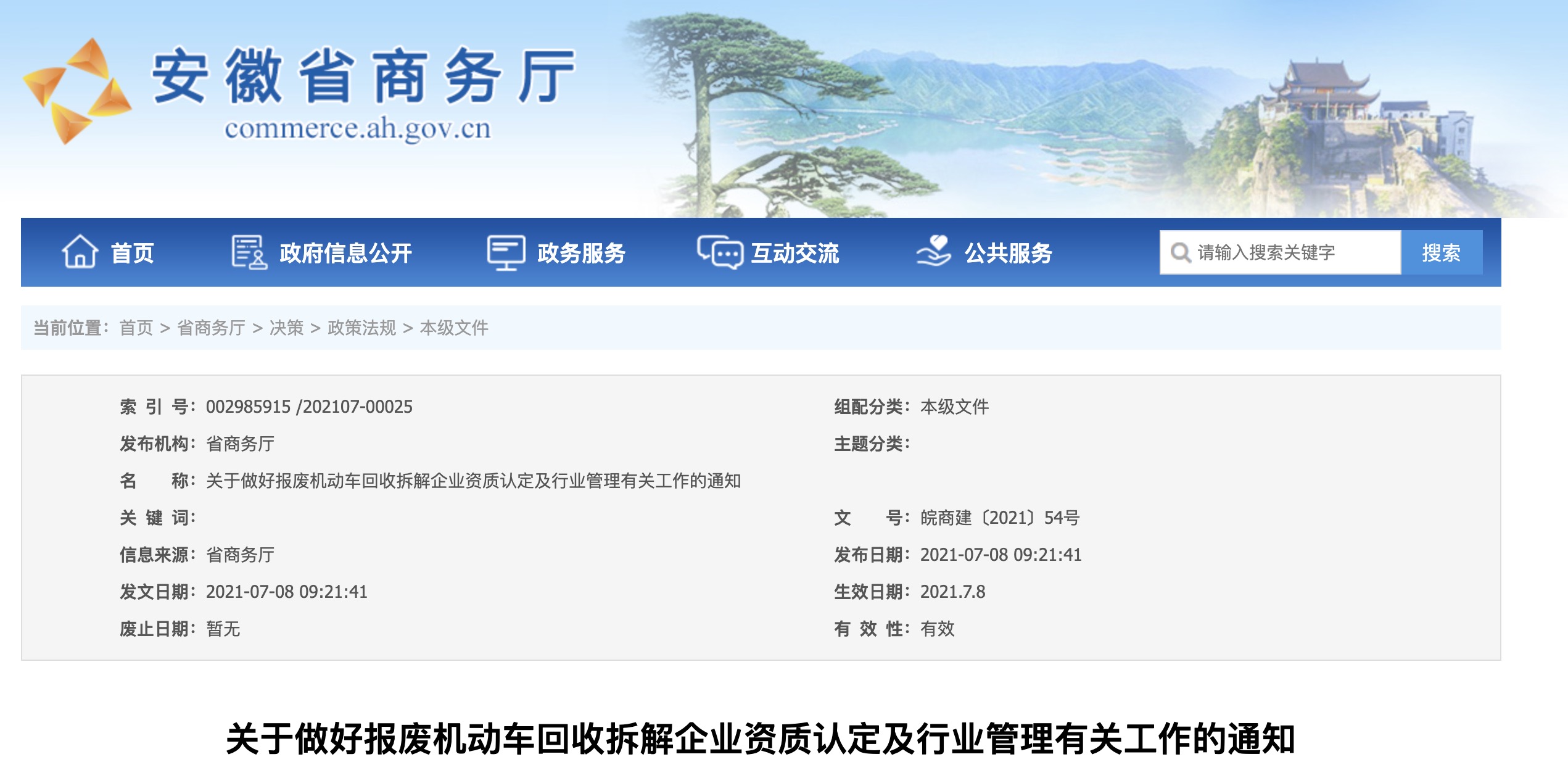 2021年7月,省商務(wù)廳、省發(fā)展改革委、省經(jīng)信廳、省公安廳、省生態(tài)環(huán)境廳、省交通運輸廳 、省市場監(jiān)管局聯(lián)合印發(fā)《關(guān)于做好報廢機動車回收拆解企業(yè)資質(zhì)認(rèn)定及行業(yè)管理...