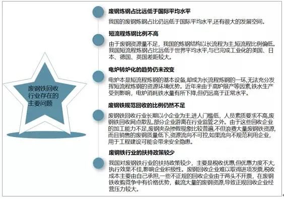 廢鋼鐵回收行業(yè)存在的主要問(wèn)題有:廢鋼煉鋼占比遠(yuǎn)低于國(guó)際平均水平、短流程煉鋼比例不高、電爐轉(zhuǎn)爐化的趨勢(shì)仍未改變、廢鋼鐵規(guī)范回收的比例仍然不足、廢鋼鐵行業(yè)的扶持政策較少等問(wèn)題。