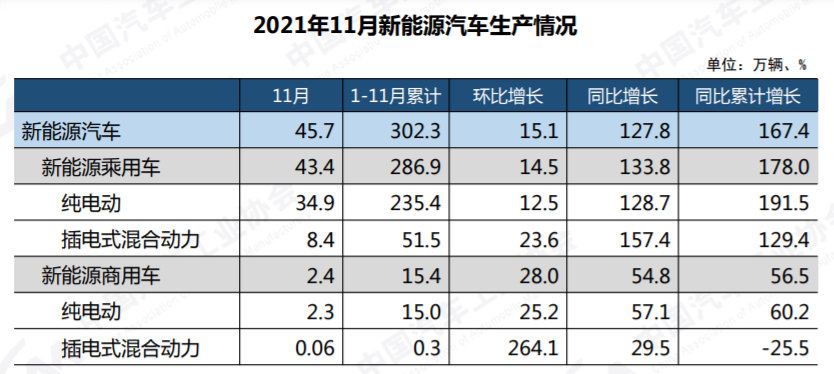 工信部原產(chǎn)業(yè)政策司副巡視員、中國國際工程咨詢公司專家學(xué)術(shù)委員會專家李萬里表示,1-11月產(chǎn)量超過300萬輛,銷量也達(dá)到299萬輛,這是一個巨大的變化,是量級的一個新躍升;也體現(xiàn)著市場牽引的力量更加明顯,超過了政策牽引的力量;并且今年以來新能源汽車月度產(chǎn)銷量保持連續(xù)穩(wěn)定增長,均為亮點(diǎn)。中汽協(xié)常務(wù)副會長兼秘書長付炳鋒也表示,我國新能源汽車銷量2021年逐月快速提升,新能源汽車市場化進(jìn)入爆發(fā)式增長新階段,1-11月產(chǎn)量突破300萬輛,這是一個巨大的變化,它代表著發(fā)展新能源汽車從過去以政策驅(qū)動為主,轉(zhuǎn)向了市場驅(qū)動。