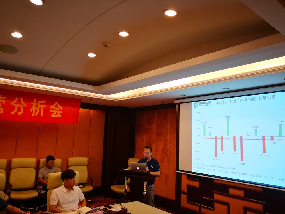 7月21-22日,玉成有限公司2018年上半年度經(jīng)營分析會在合肥外經(jīng)戴維斯酒店召開,報廢車業(yè)務(wù)板塊合資公司董事長、總經(jīng)理,集團(tuán)本部骨干員工共計近40人參加了會議,會議分別由副總裁何學(xué)海和戴子海主持。