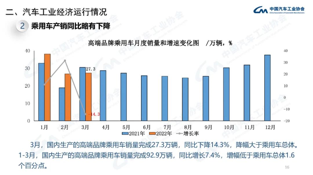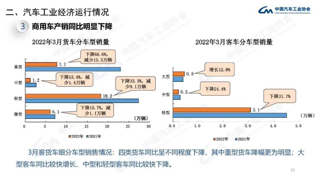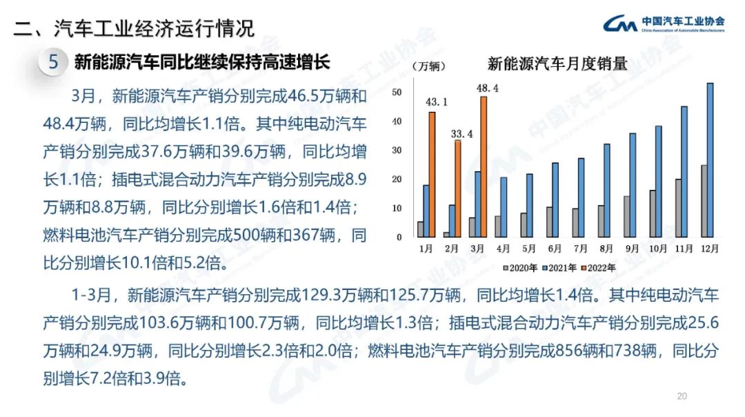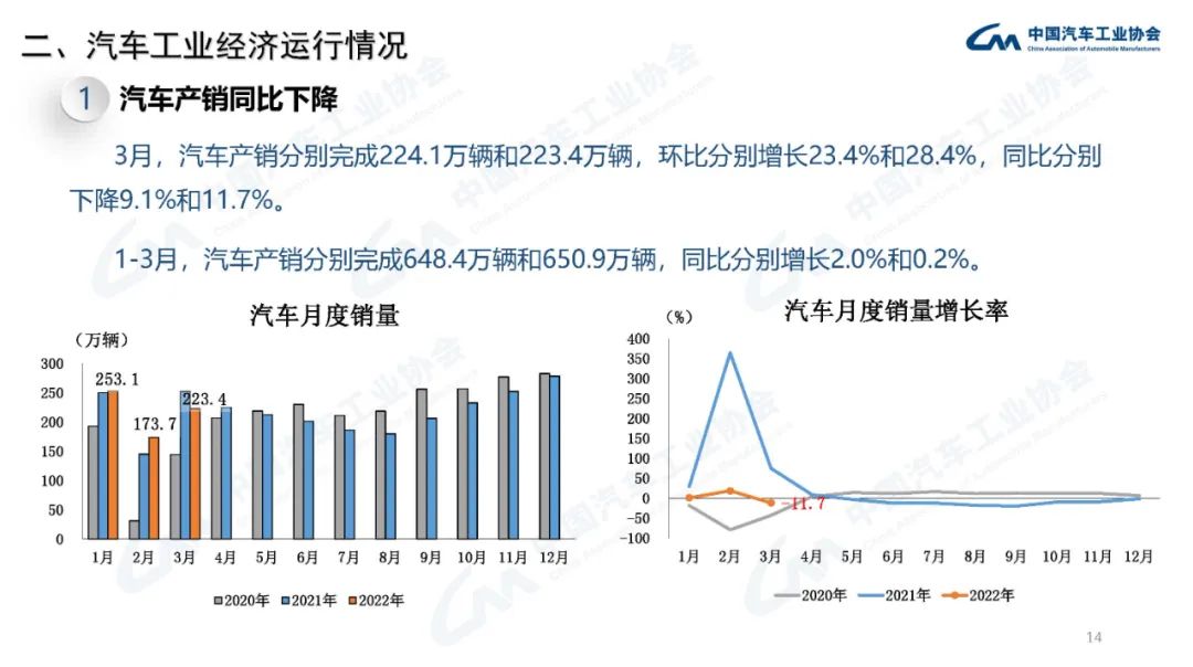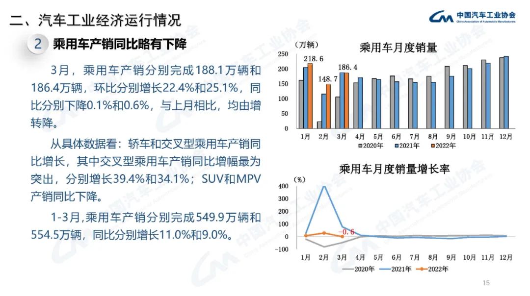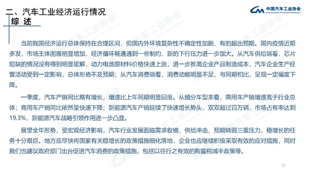 2022年3月,國內(nèi)疫情近期多發(fā),市場主體困難明顯增加,經(jīng)濟循環(huán)暢通遇到一些制約,新的下行壓力進一步加大。從汽車供給端看,芯片短缺的情況沒有得到明顯緩解,動力電池原材料價格快速上漲,進一步推高企業(yè)產(chǎn)品制造成本,汽車企業(yè)生產(chǎn)經(jīng)營活動受到一定影響,總體形勢不及預(yù)期;從汽車消費端看,消費動能明顯不足,與同期相比,呈現(xiàn)一定幅度下降。