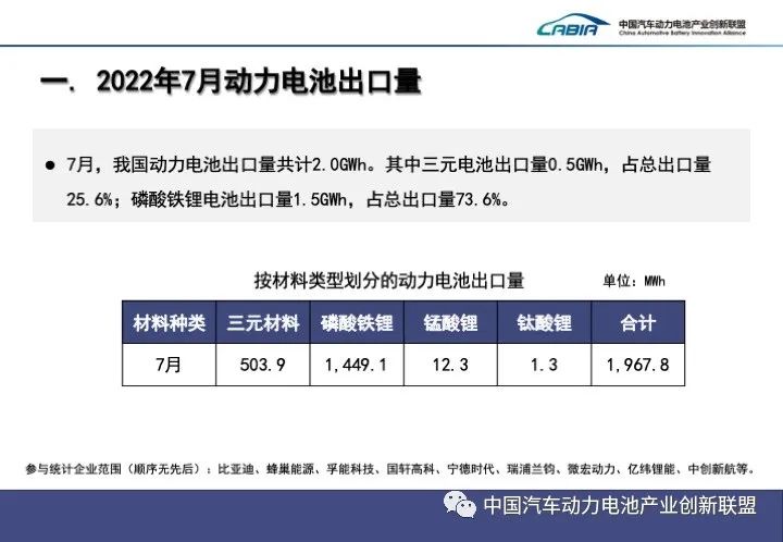 出口量方面:7月,我國(guó)動(dòng)力電池出口量共計(jì)2.0GWh。其中三元電池出口量0.5GWh,占總出口量 25.6%;磷酸鐵鋰電池出口量1.5GWh,占總出口量73.6%。